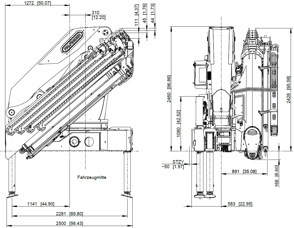 The HPSC system calculates the permissible working range for any slewing angle of the boom system and for any support situation. The position of the stabilizer support is detected by means of a cable extension transducer or magnetostrictive position sensor. Based on the intelligent calculation algorithm developed by PALFINGER, it works more efficiently than comparable systems that are available in the market.
