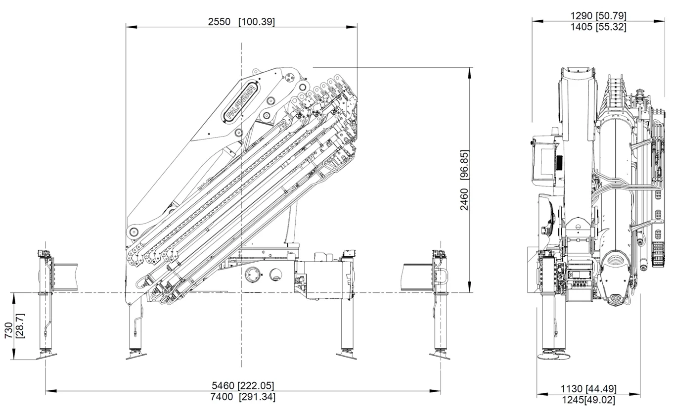 The HPSC system calculates the permissible working range for any slewing angle of the boom system and for any support situation. The position of the stabilizer support is detected by means of a cable extension transducer or magnetostrictive position sensor. Based on the intelligent calculation algorithm developed by PALFINGER, it works more efficiently than comparable systems that are available in the market.